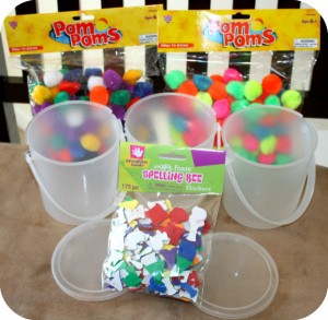 I bought four containers of chalk, foam sticker letters and pom poms. (When did pom poms get so expensive? They were 6.99 per bag!) I put all the chalk into a big outside toy bin and washed the containers out. Then I dried them, set them on the table and called the kids to help!
